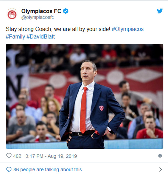 Στο μεταξύ, και η ΠΑΕ Ολυμπιακός εξέφρασε μέσω Twitter την υποστήριξή της στον Ντέιβιντ Μπλατ. Το σχετικό «τιτίβισμα» αναφέρει: «Μείνε δυνατός κόουτς, είμαστε όλοι στο πλευρό σου!».