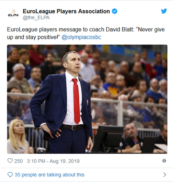 Η Ένωση Παικτών της Euroleague δεν έμεινε ασυγκίνητη στη δημοσιοποίηση του προβλήματος υγείας από τον Ντέιβιντ Μπλατ. «Ποτέ μην τα παρατάς, μείνε θετικός» ανέφερε το μήνυμα των αθλητών στον Αμερικανοισραηλινό τεχνικό.