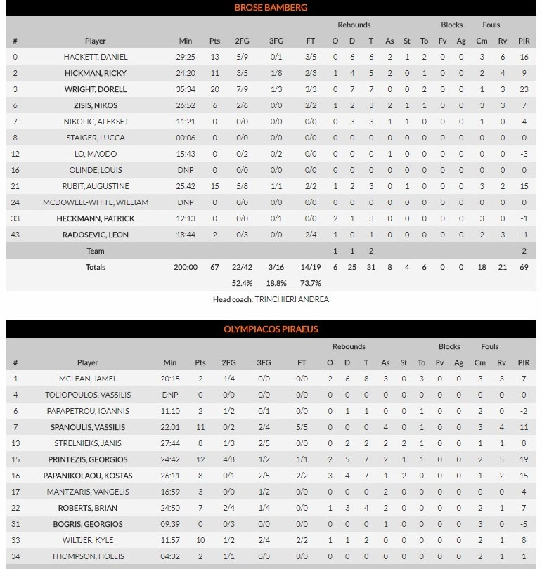 Κορυφαίος για τη Μπάμπεργκ ήταν ο Ντορέλ Ράιτ που πέτυχε 20 πόντους, με τον Ρούμπιτ (15π.) και τον πρώην ”ερυθρόλευκο” Χάκετ (13π.) να ακολουθούν. Στην αντίπερα όχθη, για τον Ολυμπιακό, ο Πρίντεζης σημείωσε 12 πόντους, ο Σπανούλης 11 και ο Ουίλτζερ 10.
