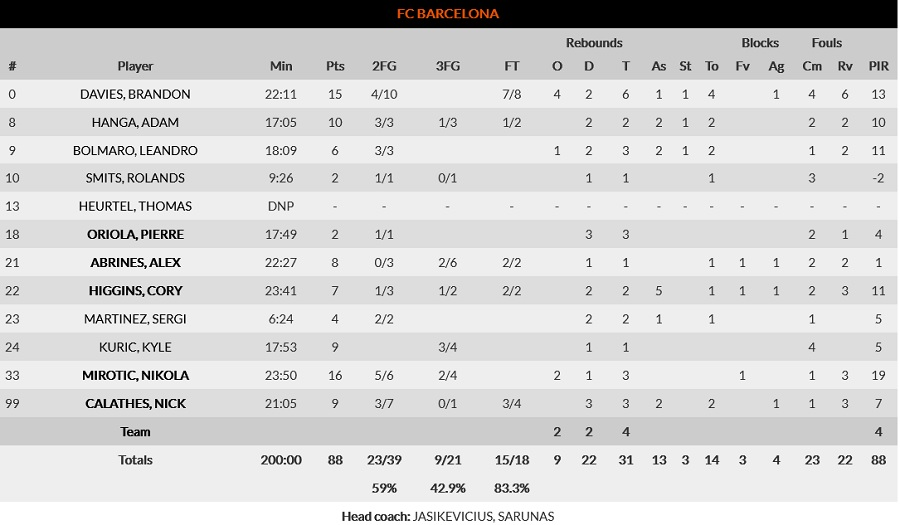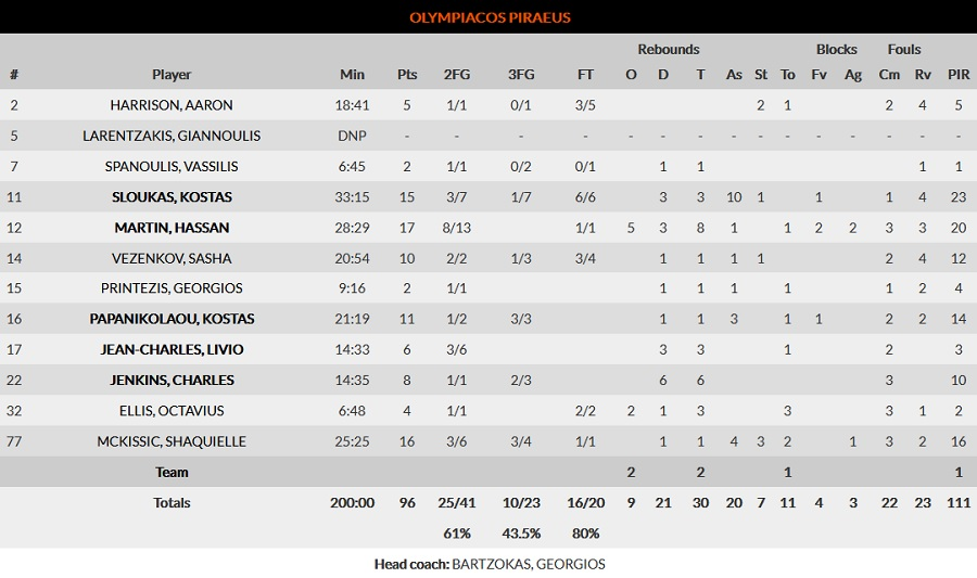 Κορυφαίοι των Πειραιωτών ήταν ο Κώστας Σλούκας με 15 πόντους και 10 ασίστ, ο Χασάν Μάρτιν με 17 πόντους και 8 ριμπάουντ και ο ΜακΚίσικ με 16 πόντους και 4 ασίστ, ενώ από τους γηπεδούχους 16 πόντους είχε ο Νίκολα Μίροτιτς, έναν λιγότερο είχε ο Μπράντον Ντέιβις, με τον Καλάθη να τελειώνει το ματς με εννέα πόντους και τρία ριμπάουντ.