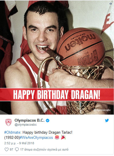 Πιο συγκεκριμένα, στον επίσημο λογαριασμό της στο facebook, η ομάδα του Πειραιά πόσταρε μία φωτογραφία του παλαίμαχου πλέον μπασκετμπολίστα, στην οποία απεικονίζεται να κρατά το πρώτο ευρωπαϊκό τρόπαιο της ομάδας, μετά τον κερδισμένο τελικό της Ρώμης, γράφοντας: «Happy birthday Dragan Tarlac!».