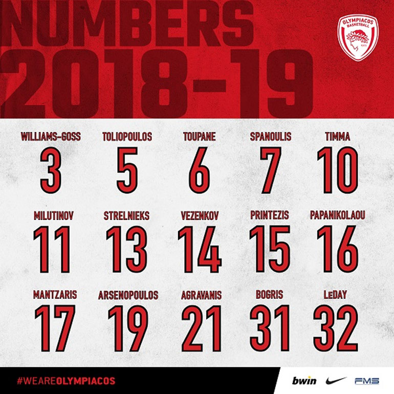 Τους αριθμούς που επέλεξαν στις φανέλες τους οι παίκτες του Ολυμπιακού ανακοίνωσε την Παρασκευή η «ερυθρόλευκη» ΚΑΕ.