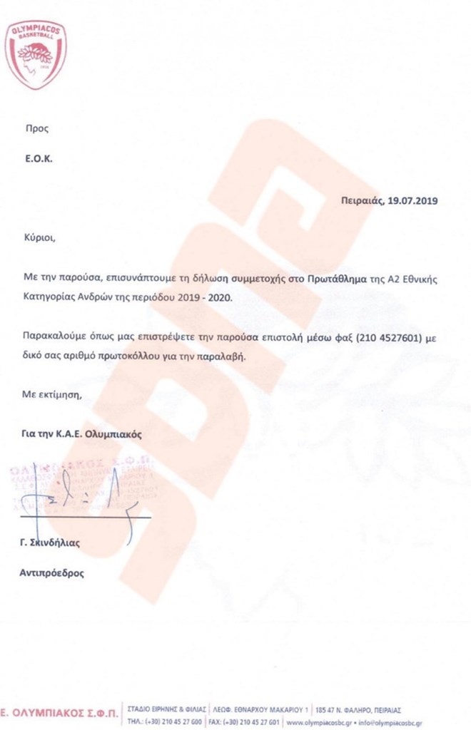 • Η δήλωση συμμετοχής στο Πρωτάθλημα της Α2 Εθνικής Κατηγορίας έγινε, σήμερα, για καθαρά νομικούς λόγους. Εάν, τελικά, κριθεί απαραίτητο να συμμετάσχουμε στο εν λόγω Πρωτάθλημα, στους αγώνες πρόκειται να παραταχθεί μια ομάδα αναπτυξιακού τύπου, απαρτιζόμενη από νεαρούς αθλητές που προέρχονται τόσο από το αναπτυξιακό πρόγραμμα του Ολυμπιακού όσο και από όλη την Ελλάδα, με διαφορετικό τίτλο – ονομασία και η οποία θα αγωνίζεται στο βοηθητικό γήπεδο του Σ.Ε.Φ.
