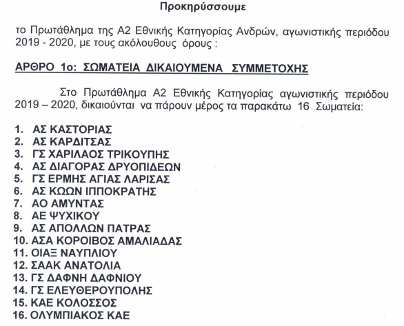 Στην Ειδική Προκήρυξη του Πρωταθλήματος της Α2 ανδρών της σεζόν 2019-20, η ΕΟΚ έχει συμπεριλάβει την ομάδα του Πειραιά, καθώς και τον Κολοσσό Ρόδου.