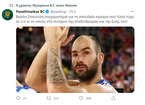 Σε μία ασυνήθιστη -για τα ελληνικά δεδομένα- κίνηση προχώρησε η ΚΑΕ Ολυμπιακός, καθώς έκανε retweet το «τιτίβισμα» του Παναθηναϊκού για την αποχώρηση του Βασίλη Σπανούλη από την ενεργό δράση!