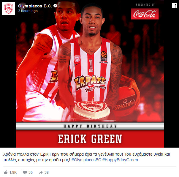 «Χρόνια πολλα στον Έρικ Γκριν που σήμερα έχει τα γενέθλια του! Του ευχόμαστε υγεία και πολλές επιτυχίες με την ομάδα μας» ανέφερε στο ευχετήριο ποστ τους οι ερυθρόλευκοι.