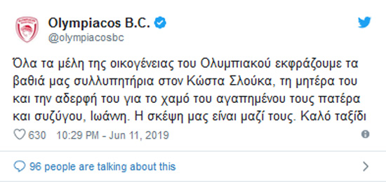 «Όλα τα μέλη της οικογένειας του Ολυμπιακού εκφράζουμε τα βαθιά μας συλλυπητήρια στον Κώστα Σλούκα, τη μητέρα του και την αδερφή του για το χαμό του αγαπημένου τους πατέρα και συζύγου, Ιωάννη. Η σκέψη μας είναι μαζί τους. Καλό ταξίδι».