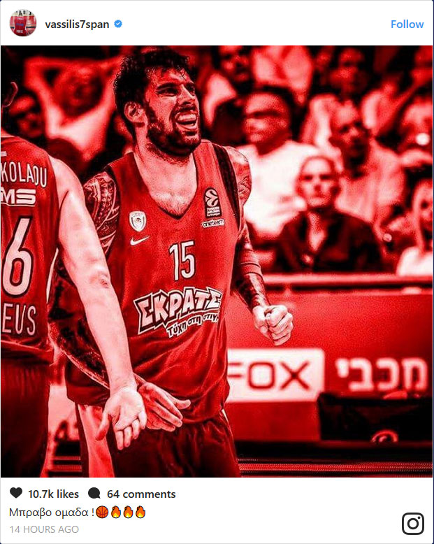 Μάλιστα, το «διπλό» των Πειραιωτών αποκτά μεγαλύτερη σημασία, καθώς επιτεύχθηκε χωρίς τον τραυματία Βασίλη Σπανούλη, ο οποίος μετά το ματς στο Ισραήλ ανέβασε στο Instagram μία φωτογραφία του Γιώργου Πρίντεζη από τη «Χάλα Πιονίρ» γράφοντας στη λεζάντα της:« Μπράβο ομάδα!».