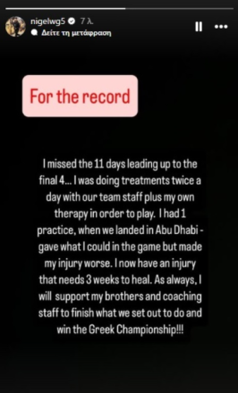 Αναλυτικά, ο Νάιτζελ Ουίλιαμς-Γκος έγραψε στο Ιnstgram, μία ημέρα πριν το τζάμπολ του Game 1 των τελικών στο ΟΑΚΑ (30/5, 21:00):