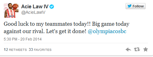 Ο Έισι Λο μέσω twitter ευχήθηκε καλή τύχη στον Ολυμπιακό για το αποψινό μεγάλο παιχνίδι με αντίπαλο τον Παναθηναϊκό στο ΟΑΚΑ. Ο Αμερικανός συνεχίζει την αποθεραπεία του για να επανέλθει δριμύτερος και μέσω του ίντερνετ έγραψε: