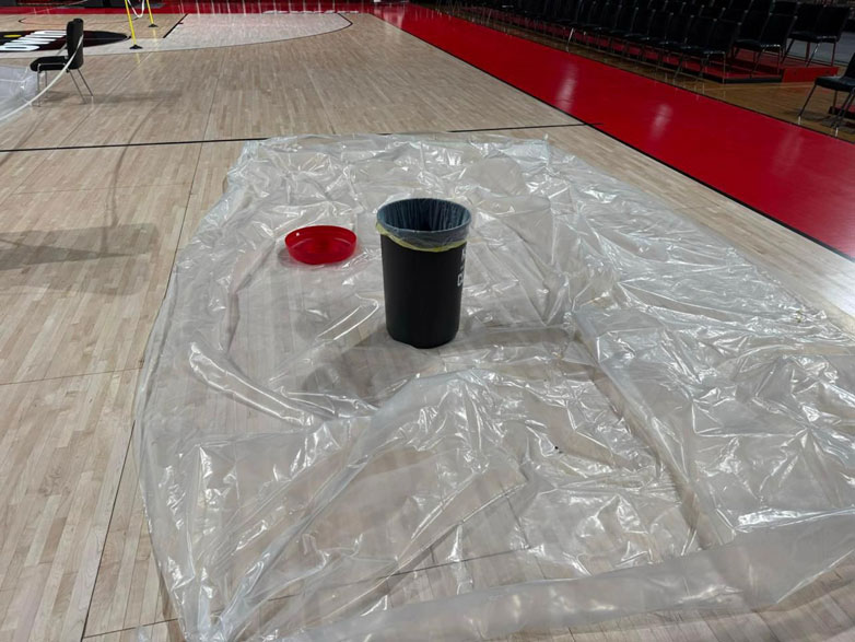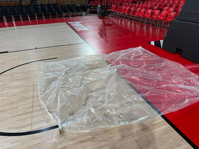 Για μία ακόμα φορά το ΣΕΦ πλημμύρισε … Η κακοκαιρία και η βροχή γέμισαν νερά το γήπεδο του Ολυμπιακού και οι υπεύθυνοι του γηπέδου τοποθέτησαν νάιλον στο παρκέ για να το προστατέψουν.