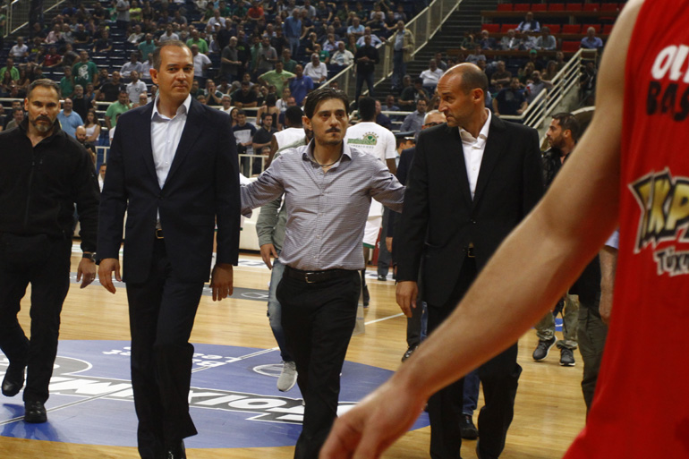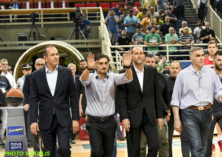 Ο Δημήτρης Γιαννακόπουλος έδωσε το παρών στο ΟΑΚΑ και παρακολούθησε τον τέταρτο τελικό της Basket League ανάμεσα στον Παναθηναϊκό και τον Ολυμπιακό και μάλιστα συνόδευσε τους διοικητικούς ηγέτες του Ολυμπιακού Παναγιώτη και Γιώργο Αγγελόπουλο στον «ερυθρόλευκο» πάγκο.