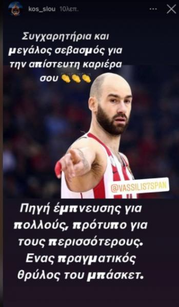 Μέσω των social media ο Κώστας Σλούκας έστειλε το δικό του μήνυμα με αφορμή την ανακοίνωση της αποχώρησης του Βασίλη Σπανούλη από την ενεργό δράση, χαρακτηρίζοντας τον συμπαίκτη του στον Ολυμπιακό θρύλο του μπάσκετ.