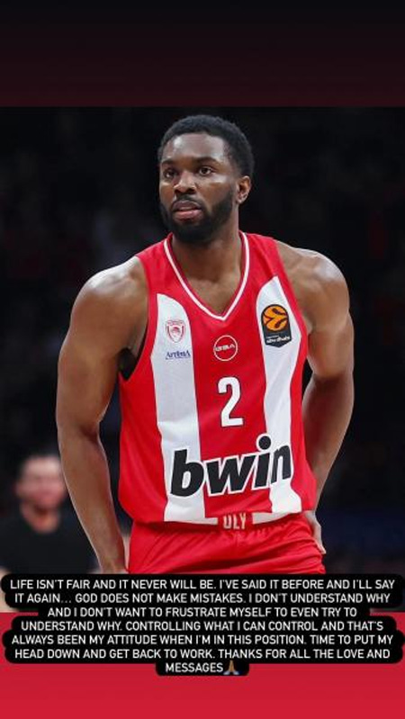 Περίπου ένα 24ωρο μετά τη νέα ρήξη αχιλλείου, την οποία υπέστη, στην επανεμφάνισή του στην Euroleague, μετά από 580 ημέρες αναμονής, βρήκε τη δύναμη και έκανε μία ανάρτηση στο Instagram για να ευχαριστήσει τον κόσμο για την αγάπη που του δείχνει, τονίζοντας μεταξύ άλλων ότι «η ζωή δεν είναι δίκαιη και δεν θα είναι ποτέ».