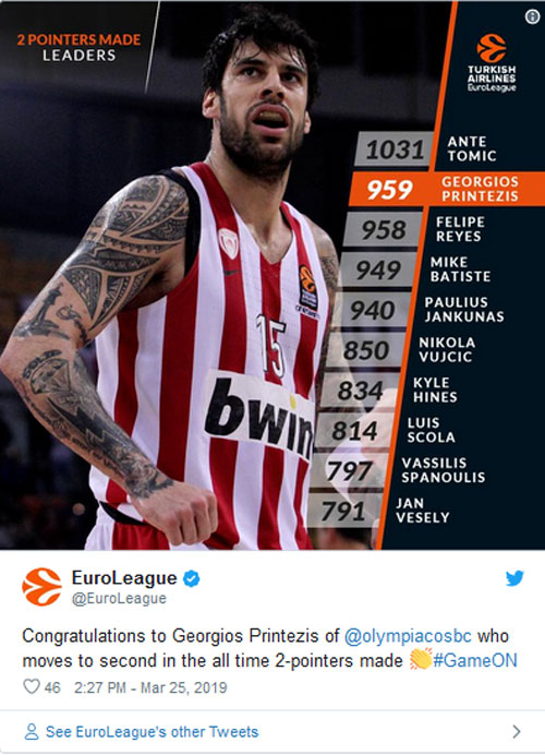 Στο παιχνίδι του Ολυμπιακού απέναντι στην Γκραν Κανάρια ο Γιώργος Πρίντεζης πέρασε στη δεύτερη θέση όλων των εποχών στη Euroleague στην κατηγορία των διπόντων, καθώς έφτασε τα 959.