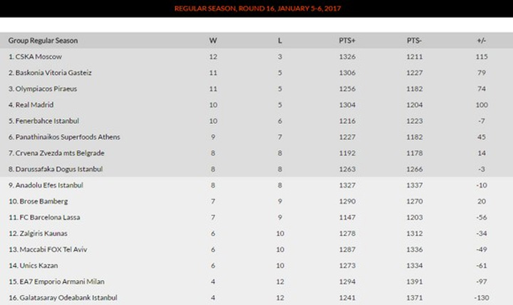 Με τον Ολυμπιακό να επικρατεί του Παναθηναϊκού Superfoods στο Στάδιο Ειρήνης και Φιλίας ολοκληρώθηκε η 16η αγωνιστική της Ευρωλίγκας. Δείτε τα αποτελέσματα και τη βαθμολογία της διοργάνωσης: