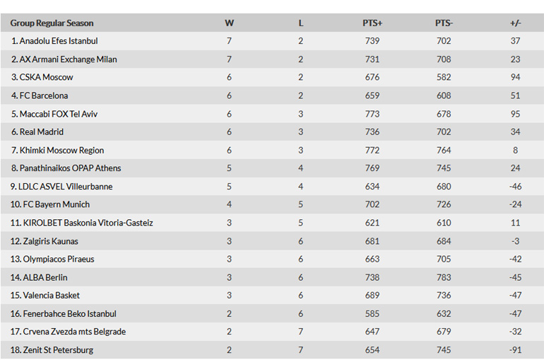 Από εκεί και πέρα, Αρμάνι Μιλάνο και Αναντολού Εφές αναρριχήθηκαν στην κορυφή της κατάταξης, μετά την ολοκλήρωση του «κυρίως πιάτου» της 9ης αγωνιστικής, τη στιγμή που Χίμκι και Μακάμπι Τελ Αβίβ υποχώρησαν σε 6-3, δίνοντας τέλος στην εξαπλή ισοβαθμία που είχε προκύψει.
