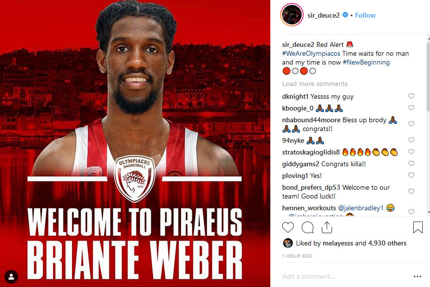 Λίγες ώρες μετά την ολοκλήρωση της μεταγραφής του στον Ολυμπιακό ο Μπριάντε Γουέμπερ προχώρησε σε ένα… «ερυθρόλευκο» post, εκφράζοντας τον ενθουσιασμό του που πλέον ανήκει στο δυναμικό των Πειραιωτών.