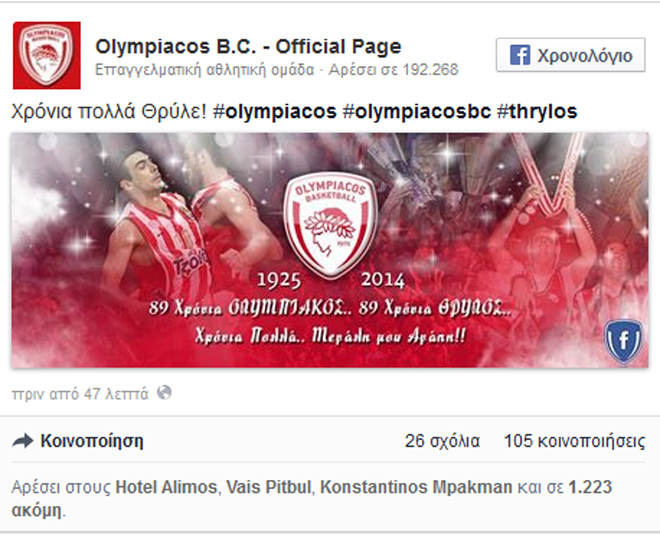 Η ΚΑΕ Ολυμπιακός μέσω του λογαριασμού της στο facebook ανήρτησε μια φωτογραφία για τα γενέθλια του συλλόγου! Όπως αναφέρει στη λεζάντα η ομάδα μπάσκετ...