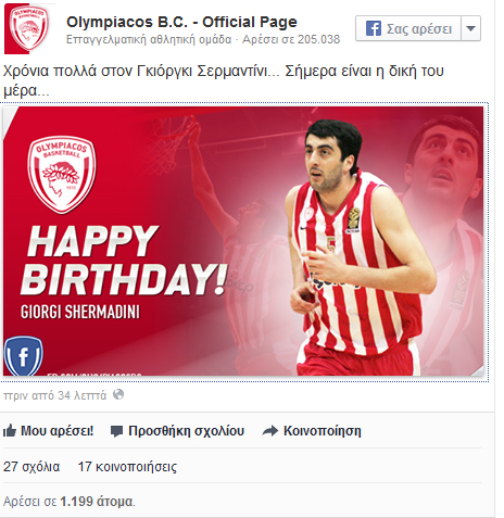Η ΚΑΕ Ολυμπιακός ευχήθηκε χρόνια πολλά στον Γκιόργκι Σερμαντίνι, μέσω της σελίδας της στο Facebook. Ο Γεωργιανός σέντερ κλείνει σήμερα τα 25 και όπως...