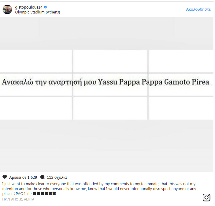 «Θέλω να καταστήσω σαφές προς όποιον προσβλήθηκε από τα σχόλιά μου για τον συμπαίκτη μου, ότι δεν ήταν αυτή η πρόθεσή μου. Όσοι με γνωρίζουν προσωπικά, ξέρουν πως δεν θα έδειχνα ασέβεια από πρόθεση σε κανέναν άνθρωπο ή κανένα μέρος», ανέφερε μέσω Instagram.