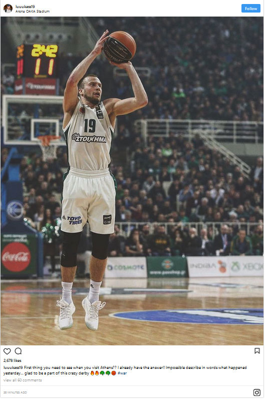 «Το πρώτο μέρος που πρέπει να δεις όταν έρθεις στην Αθήνα; Έχω ήδη την απάντηση! Δεν μπορώ να περιγράψω με λόγια αυτά που έγιναν χθες. Είμαι χαρούμενος που είμαι μέρος αυτού του τρελού ντέρμπι» έγραψε στον προσωπικό του λογαριασμό στο Instagram ο Λιθουανός.