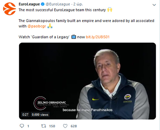 Πιο συγκεκριμένα, η διοργανώτρια αρχή προχώρησε στο εν λόγω σχολιο σε ποστάρισμά της στο video, όπου ο Ζέλικο Ομπράντοβιτς αναφέρεται σε όλα όσα προσέφερε η οικογένεια Γιαννακόπουλου.