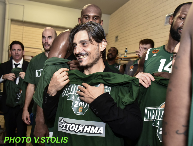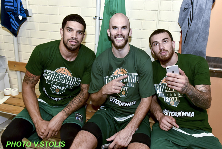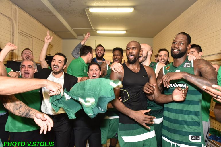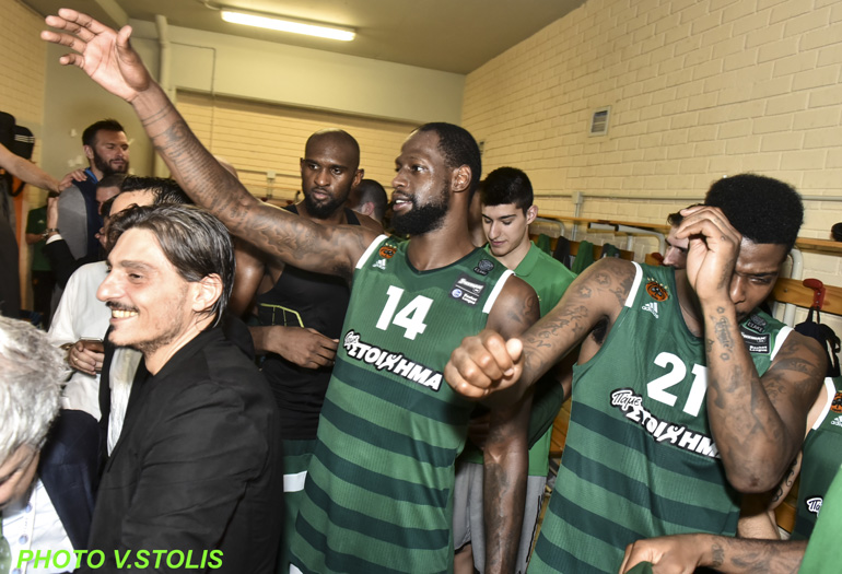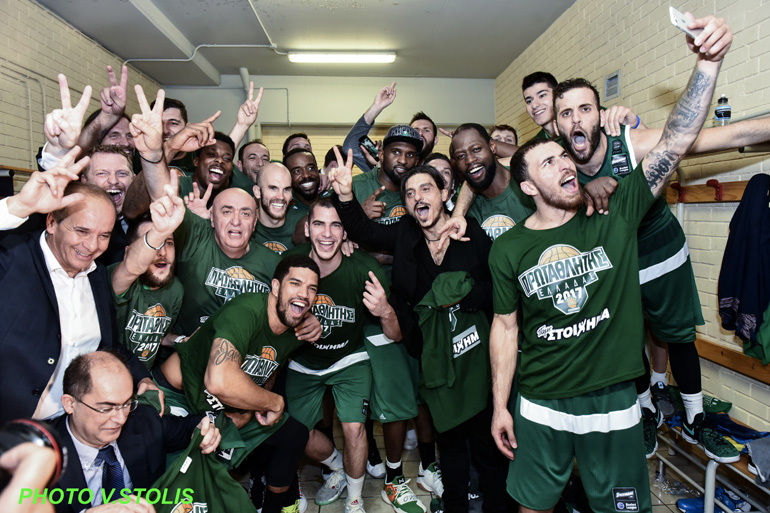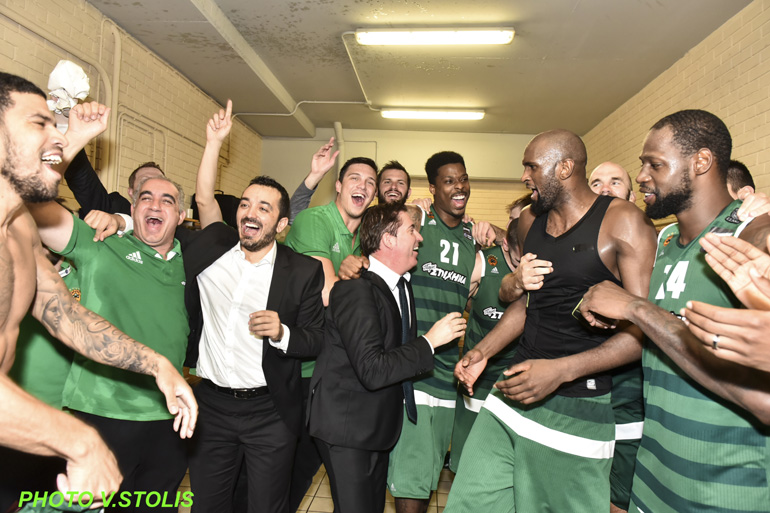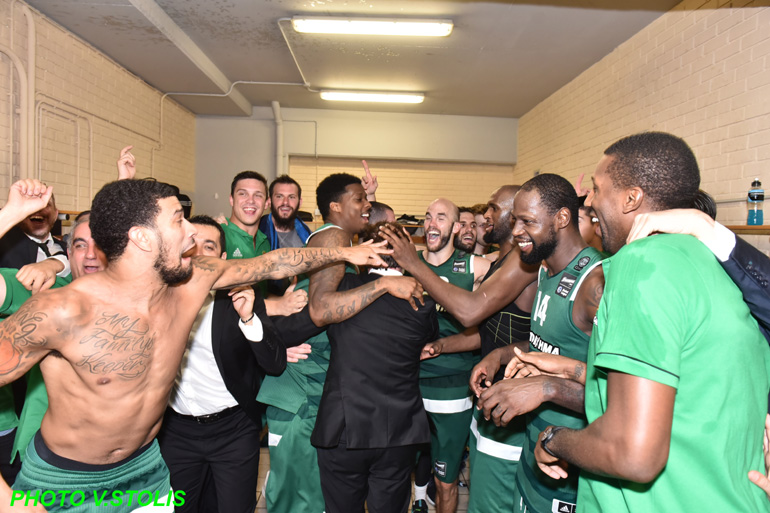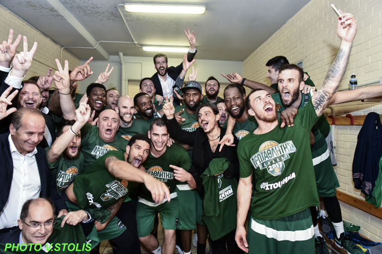 Οι παίκτες και το τεχνικό επιτελείο του Παναθηναϊκού γιόρτασαν για την μεγάλη νίκη επί του Ολυμπιακού και την κατάκτηση του πρωταθλήματος της Basket League μέσα στα αποδυτήρια του ΣΕΦ.