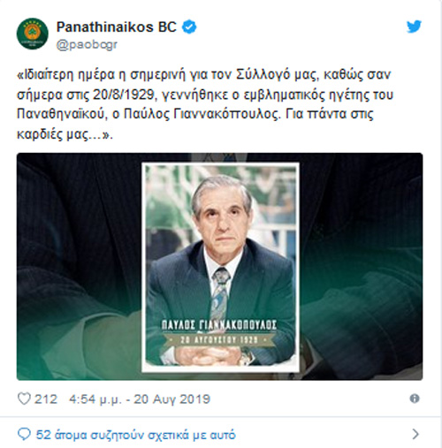 Στο μήνυμά της η ΚΑΕ Παναθηναϊκός αναφέρει: «Ιδιαίτερη ημέρα η σημερινή για τον Σύλλογό μας, καθώς σαν σήμερα στις 20/8/1929, γεννήθηκε ο εμβληματικός ηγέτης του Παναθηναϊκού, ο Παύλος Γιαννακόπουλος. Για πάντα στις καρδιές μας…».