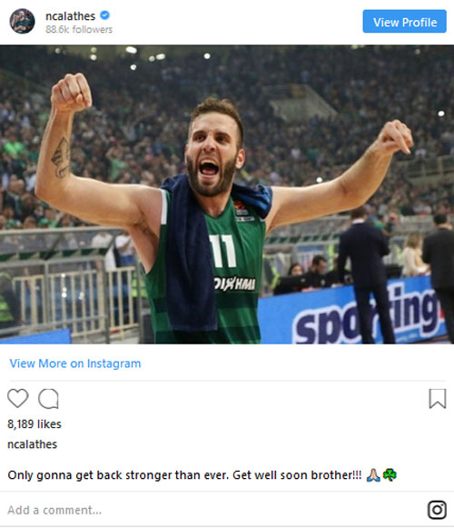 Ο Νικ Καλάθης με μήνυμά του στα social media εξέφρασε τη συμπαράστασή του στον Νίκο Παππά, ο οποίος υπέστη ρήξη πρόσθιου χιαστού στη σημερινή προπόνηση και θα χάσει το υπόλοιπο της σεζόν.