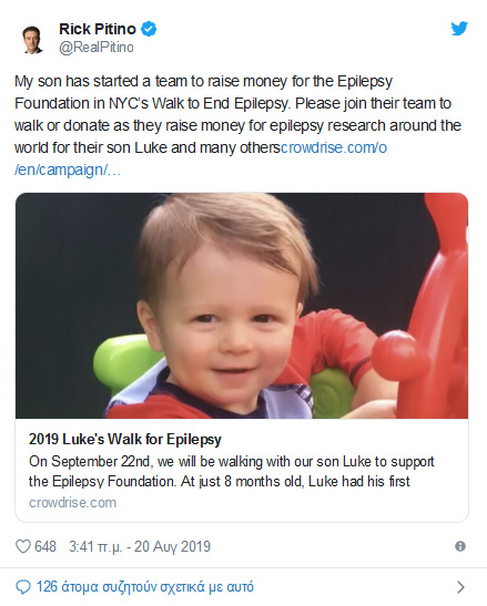 O Ρικ Πιτίνο έγραψε χαρακτηριστικά στο Twitter: «Ο γιος μου άνοιξε λογαριασμό για να μαζέψει χρήματα για το Ίδρυμα Επιληψίας στη Νέα Υόρκη.