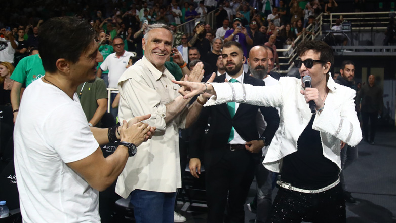 O Δημήτρης Γιαννακόπουλος χειροκροτεί τον Νίνο, που τραγούδησε στο κλειστό του ΟΑΚΑ