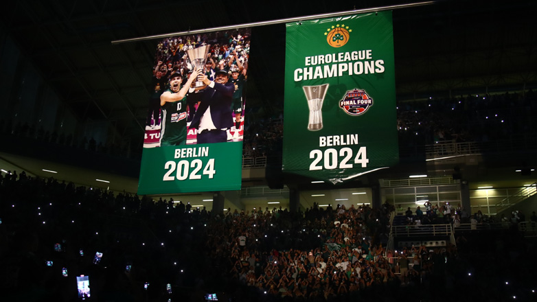 Τέλος, το λάβαρο με τον έβδομο ευρωπαϊκό τίτλο πήρε τη θέση του στην οροφή του ΟΑΚΑ, συνοδευόμενο από ακόμη ένα με φωτό των πρωταγωνιστών Εργκίν Αταμάν και Κώστα Σλούκα, τη στιγμή που ύψωναν στον γερμανικό… ουρανό το τρόπαιο της Euroleague.
