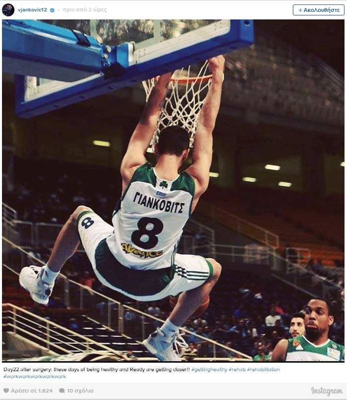 Ο Βλάντο Γιάνκοβιτς ανήρτησε φωτογραφία στο instagram κάτω από την οποία αναφέρει ότι οι ημέρες που θα επιστρέψει στο παρκέ πλησιάζουν. Ο 26χρονος άσος του Παναθηναϊκού, που είχε υποστεί κάταγμα στο δεύτερο μετακάρπιο του αριστερού χεριού έγραψε: