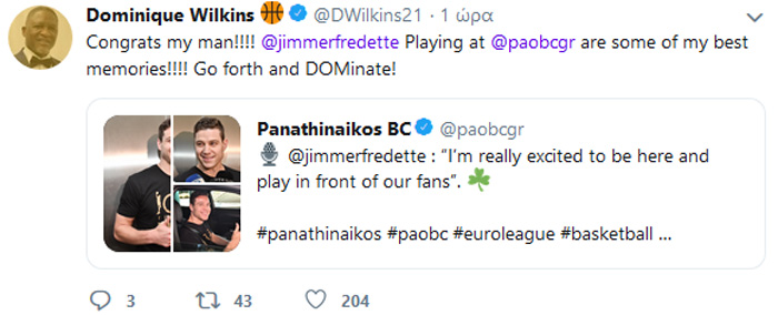 Η άφιξη του Τζίμερ Φριντέτ επί ελληνικού εδάφους έδωσε την ευκαιρία στον Ντομινίκ Ουίλκινς να θυμηθεί το «πράσινο» παρελθόν του, στέλνοντας παράλληλα το δικό του μήνυμα στο νέο γκαρντ του Παναθηναϊκού.