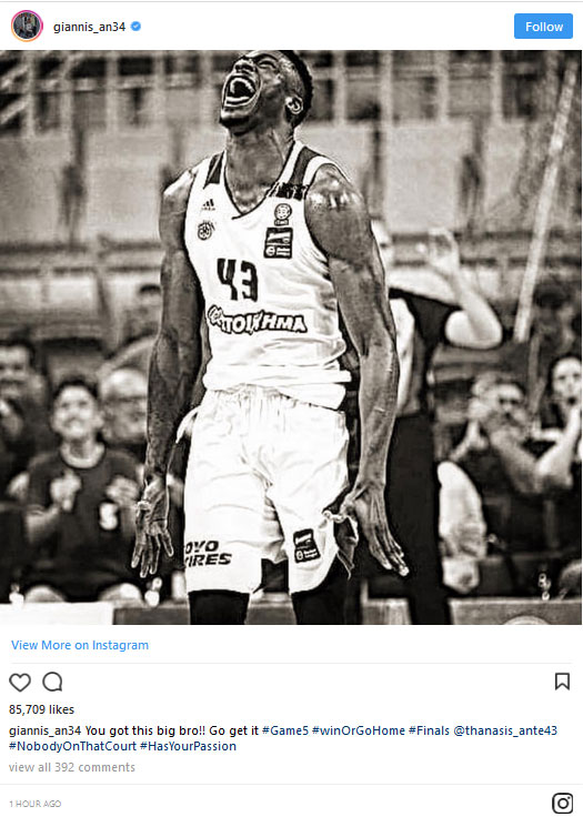 Ο αστέρας των Μιλγουόκι Μπάκς, Γιάννης Αντετοκούνμπο την Παρασκευή ευχήθηκε, μέσω instagram, στον αδερφό του, Θανάση να σηκώσει το πρωτάθλημα με τον Παναθηναϊκό, γράφοντας χαρακτηριστικά: «Το έχεις, μεγάλε αδερφέ! Πήγαινε σήκωσέ το»
