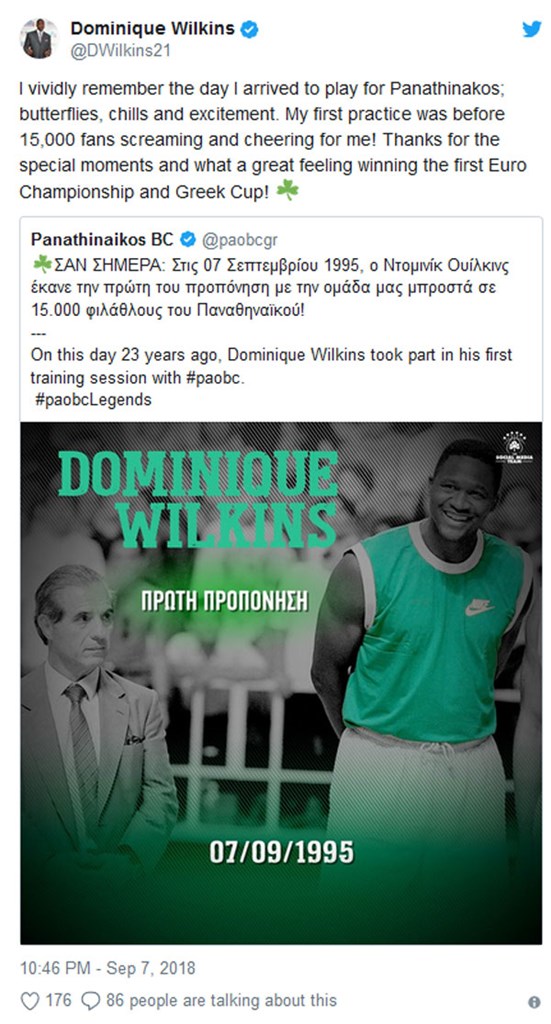 Οι πρωταθλητές Ελλάδας είχαν υπενθυμίσει μέσω των social media σήμερα (7/9) το πρωί ότι… «ΣΑΝ ΣΗΜΕΡΑ: Στις 07 Σεπτεμβρίου 1995, ο Ντομινίκ Ουίλκινς έκανε την πρώτη του προπόνηση με την ομάδα μας μπροστά σε 15.000 φιλάθλους του Παναθηναϊκού!».
