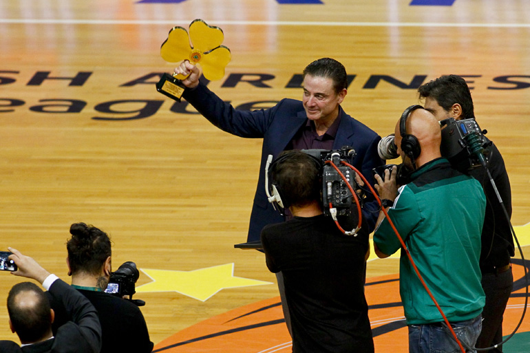 O πρώην τεχνικός του «τριφυλλιού» βραβεύτηκε στο ημίχρονο του αγώνα με τις «νυχτερίδες» ,δια χειρός του ισχυρού άνδρα της «πράσινης» ΚΑΕ, Δημήτρη Γιαννακόπουλου, για την περυσινή προσφορά του στο σύλλογο, η οποία είχε κατάληξη την κατάκτηση του νταμπλ (πρωτάθλημα και Κύπελλο Ελλάδας).