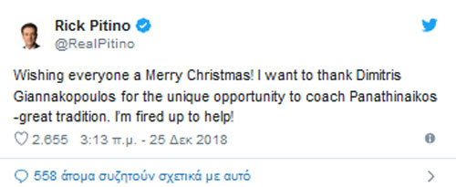«Εύχομαι σε όλους καλά Χριστούγεννα. Θέλω να ευχαριστήσω τον Δημήτρη Γιαννακόπουλο για την ευκαιρία που μου έδωσε να κοουτσάρω τον Παναθηναϊκό που έχει μεγάλη παράδοση. Είμαι πανέτοιμος να βοηθήσω», έγραψε ο 66χρονος τεχνικός στο δημοφιλές μέσο κοινωνικής δικτύωσης.
