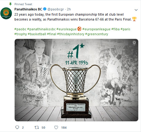 «Πριν από 23 χρόνια, ο πρώτος τίτλος του Ευρωπαϊκού πρωταθλήματος γίνεται πραγματικότητα, καθώς ο Παναθηναϊκός κερδίζει την Μπαρτσελόνα με 67-66 στον τελικό του Παρισιού».