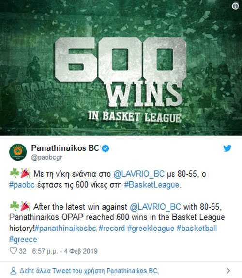 Οι «πράσινοι», όπως ήταν λογικό, ανακοίνωσαν αυτό το επίτευγμά τους με σχετική ανάρτηση στα social media, στην οποία ανέφεραν: «Με τη νίκη ενάντια στο @LAVRIO_BC με 80-55, ο #paobc έφτασε τις 600 νίκες στη #BasketLeague».