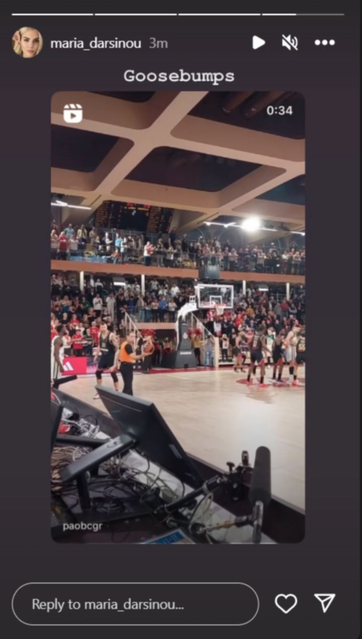 Η σύζυγος του Κώστα Σλούκα, Μαρία Δαρσινού ανήρτησε σε στόρι ένα video με την τελευταία φάση του αγώνα και έγραψε χαρακτηριστικά «ανατριχίλα», αναφερόμενη φυσικά στο επικό buzzer-beater τρίποντο του Γκριγκόνις που χάρισε τη νίκη στο «τριφύλλι».
