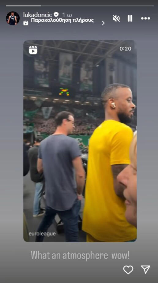 Η ατμόσφαιρα στο κλειστό του ΟΑΚΑ εντυπωσίασε και τον Σλοβένο NBAer, Λούκα Ντόντσιτς, ο οποίος με στόρυ του έσπευσε να βγάλει το… καπέλο στους φιλάθλους των πρασίνων, γράφοντας «What an atmosphere wow» (Τι ατμόσφαιρα, ουάου).