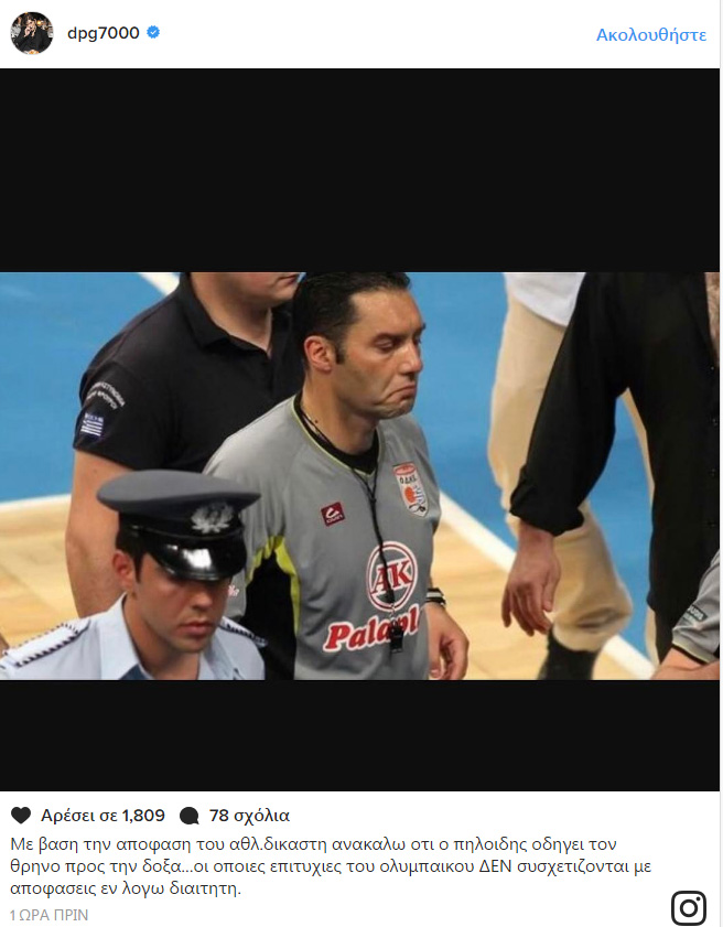 Η αντίδραση του Δημήτρη Γιαννακόπουλου στην απόφαση του Αθλητικού Δικαστή ήταν άμεση. Μέσω του Instagram ο ισχυρός άνδρας του Παναθηναϊκού έγραψε: «Με βάση την απόφαση του Αθλητικού Δικαστή ανακαλώ οτι ο Πηλοΐδης οδηγεί τον θρήνο προς την δόξα… Οι όποιες επιτυχίες του Ολυμπιακού ΔΕΝ συσχετίζονται με αποφάσεις του εν λόγω διαιτητή…».