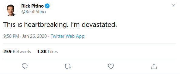 Ο θρύλος του NCAA και προπονητής του Παναθηναϊκού, Ρικ Πιτίνο, μετά την είδηση του θανάτου του θρύλου των Λέικερς, έπειτα από συντριβή ελικοπτέρου, έγραψε στο twitter: «Αυτή η είδηση σου ραγίζει την καρδιά. Είμαι συντετριμμένος».