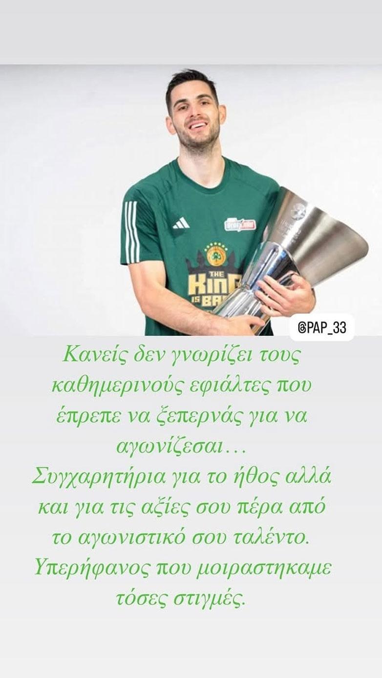 Συγχαρητήρια για το ήθος, αλλά και για τις αξίες σου πέρα από το αγωνιστικό σου ταλέντο. Υπερήφανος που μοιραστήκαμε τόσες στιγμές».