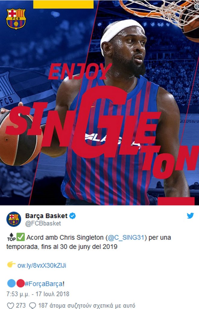 H Μπαρτσελόνα είναι ο νέος σταθμός της καριέρας του Κρις Σίνγκλετον, καθώς οι Καταλανοί την Τρίτη ανακοίνωσαν κι επίσημα την απόκτηση του Αμερικανού πάουερ φόργουορντ.