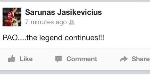 Ο Σαρούνας Γιασικεβίτσιους, περί ου ο λόγος, δεν ξέχασε την πρώην του ομάδα και δεν έκρυψε τη χαρά του για την κατάκτηση του πρωταθλήματος μέσα στο ΣΕΦ, γράφοντας στο Facebook: «Παναθηναϊκός… ο θρύλος συνεχίζεται».
