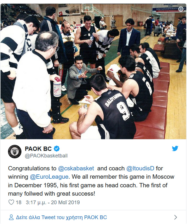 «Συγχαρητήρια στην ΤΣΣΚΑ Μόσχας και στον προπονητή της, Δημήτρη Ιτούδη, για την κατάκτηση της Ευρωλίγκας. Όλοι θυμόμαστε το παιχνίδι στη Μόσχα τον Δεκέμβριο του 1995, που ήταν το πρώτο του ως head coach. Το πρώτο από τα πρώτα με μεγάλη επιτυχία που ακολούθησαν», αναφέρουν οι Θεσσαλονικείς.