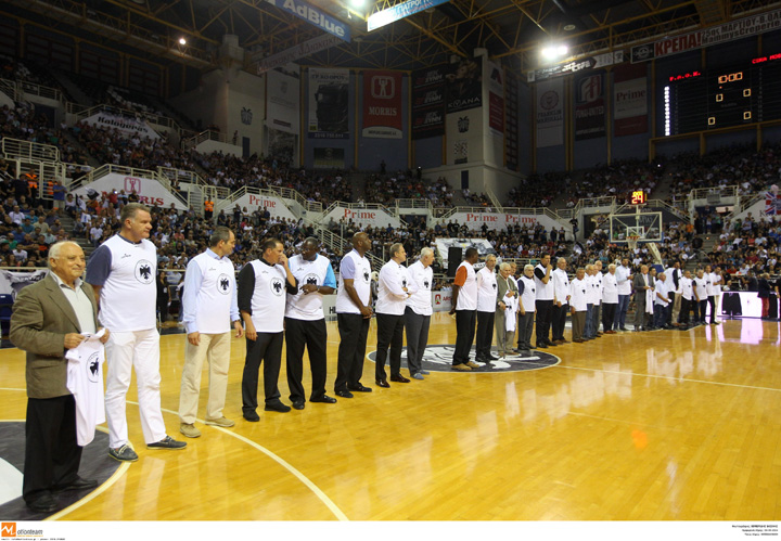 Πρώτος τον αγωνιστικό χώρο του γηπέδου πάτησε ο αρχηγός της ομάδας του «Δικεφάλου» του 1959, Δημήτρης Δαπόντε, ακολούθησαν οι Στέργιος Αστεριάδης, Γιώργος Οικονόμου, Αλέκος Παρασκευάς, Τζίμης Ανδρεάδης, Άγγελος Μιχόπουλος, Γιώργος Τσομπανάκης, Μάνθος Κατσούλης, Αχιλλέας Μαματζιόλας, Κεν Μπάρλοου, Κλιφ Λέβινγκστον, Μάικ Τζόουνς, Γιώργος Μπαλογιάννης, Νίκος Μπουντούρης, Χρήστος Τσέκος, Ευθύμης Ρεντζιάς, Δήμος Φυντανίδης, Ντράγκαν Σάκοτα, Ντούσαν Ιβκοβιτς, Κώστας Φλεβαράκης, Απόστολος Οικονομίδης, Απόστολος Αλεξόπουλος, Μπάνε Πρέλεβιτς, Νίκος Σταυρόπουλος, Σούλης Μαρκόπουλος και Κώστας Χαραλαμπίδης.